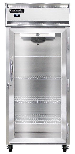 Extra-Wide Refrigerator, reach-in, 36-1/4″ wide one-section, self-contained refrigeration, aluminum exterior & interior, stainless steel front, shallow depth, full-height glass door, electronic controller w/ digital display, 5″ casters, 1/3 hp