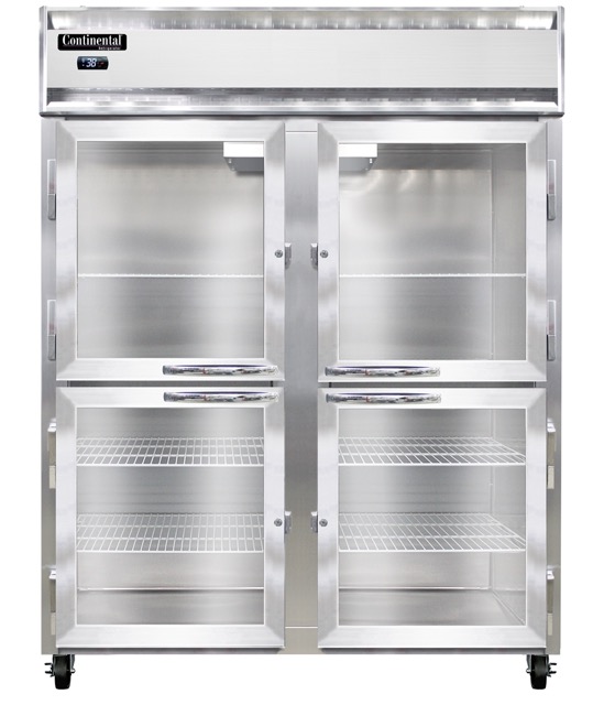 Extra-Wide Refrigerator, reach-in, 57″ wide two-section, self-contained refrigeration, aluminum exterior & interior, stainless steel front, standard depth, wide half-height glass doors, electronic controller w/ digital display, electric condensate evaporator, 5″ casters, 1/2 hp