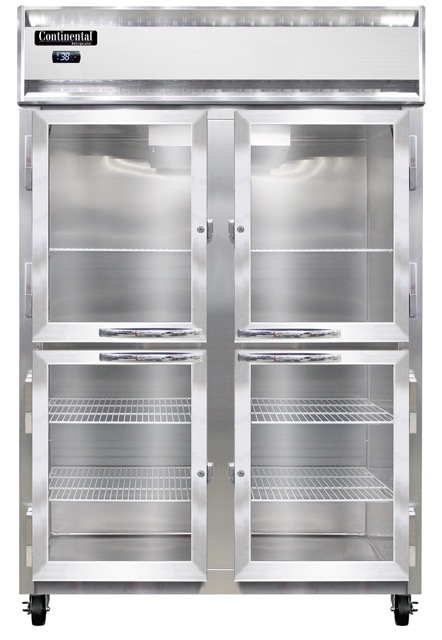 Refrigerator, reach-in display, two-section, self-contained refrigeration, aluminum exterior & interior, stainless steel front, shallow depth, narrow hinged glass half doors, electronic controller w/ digital display, 5″ casters, 1/2 hp