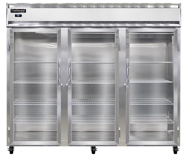 Extra-Wide Refrigerator, pass-thru, 85-1/2″ wide three-section, self-contained refrigeration, stainless steel front, aluminum interior & ends, standard depth, full-height glass doors on front, full-height solid doors on rear, electronic controller w/ digital display, electric condensate evaporator, 5″ casters