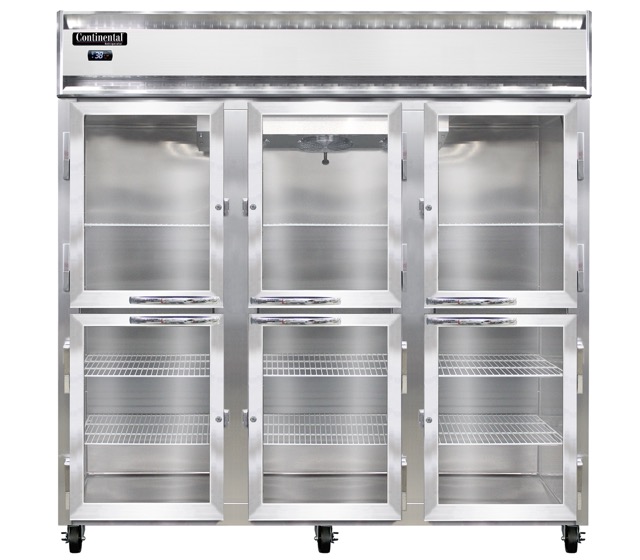 Refrigerator, reach-in display, three-section, self-contained refrigeration, aluminum exterior & interior, stainless steel front, standard depth, narrow hinged glass half doors, electronic controller w/ digital display, electric condensate evaporator, 5″ casters, 3/4 hp