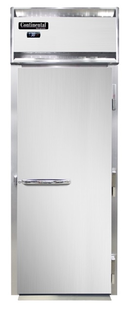 Designer Line Refrigerator, roll-thru, one-section, self-contained refrigeration, stainless steel front, aluminum interior & ends, standard depth cabinet, full-height solid door on front, full-height glass door on rear, electronic controller w/ digital display, removable stainless steel ramps, electronic controller w/ digital display