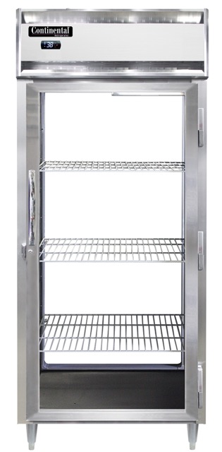 Designer Line Extra-Wide Refrigerator, pass-thru, 36-1/4″ wide one-section, self-contained refrigeration, aluminum exterior & interior, stainless steel front, standard depth cabinet, wide full-height glass doors on front and rear, 6″ adjustable stainless steel legs, electronic controller w/ digital display