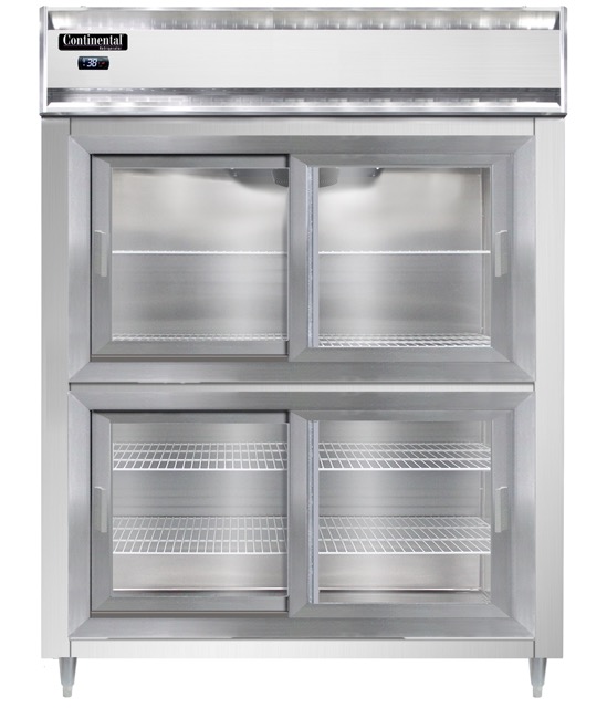 Designer Line Wide Refrigerator, reach-in, 57″ wide two-section, self-contained refrigeration, aluminum exterior & interior, stainless steel front, standard depth cabinet, wide half-height sliding glass doors, 6″ stainless steel legs, electronic controller w/ digital display, 1/2 hp