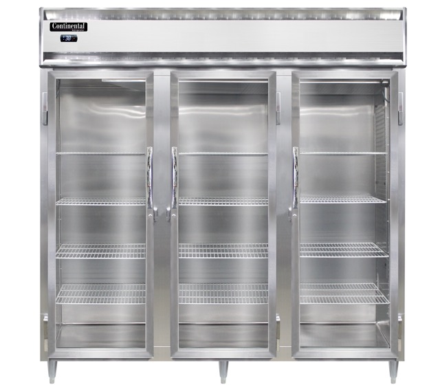 Designer Line Refrigerator, pass-thru, three-section, self-contained refrigeration, aluminum exterior & interior, stainless steel front, standard depth cabinet, full-height glass doors on front, full-height stainless steel doors on rear, 6″ stainless steel legs, electronic controller w/ digital display