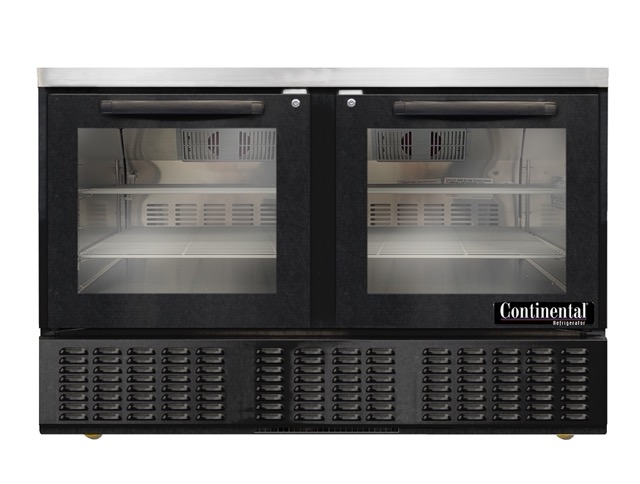 Undercounter Freezer, 48″W, 9 cu ft capacity, two section, (2) hinged glass doors, stainless top, baked black enamel finish exterior, aluminum interior, 5″ diameter caster plates, front breathing, rear mounted self-contained refrigeration, R290 Hydrocarbon refrigerant, 1/4hp, cETLus, NSF